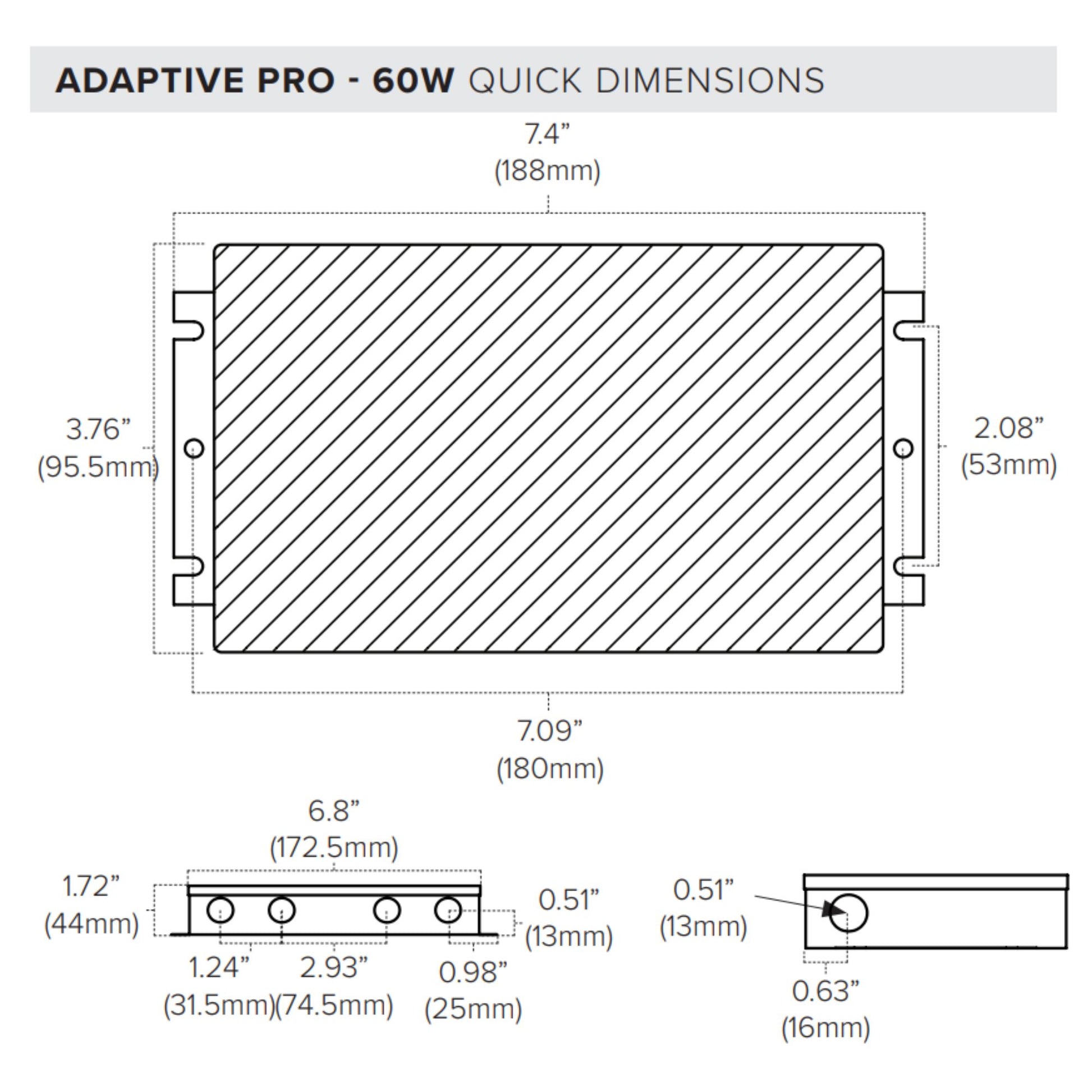 The Adaptive Pro 5-in-1 dimmable Class 2 driver delivers compact 24V DC constant voltage power for any standard MLV/ELV/Incandescent TRIAC dimmer or secondary side electronic controls. Encased in a slim, low-profile aluminum enclosure with integrated knock-outs for easy installation in any low voltage application.