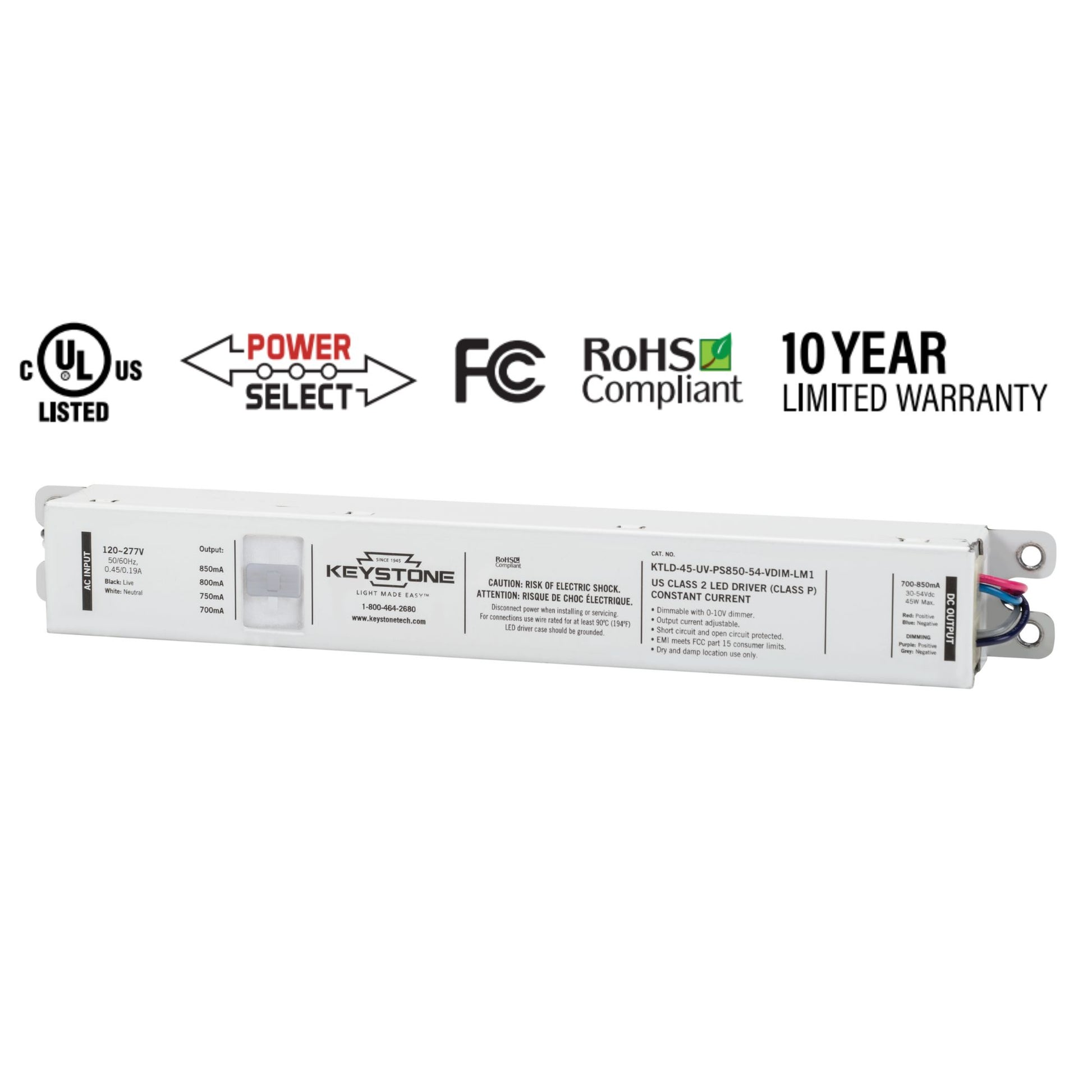 45 Watts LED Driver, Selectable Current 700-850mA, 0-10V Dimming, 120-277V