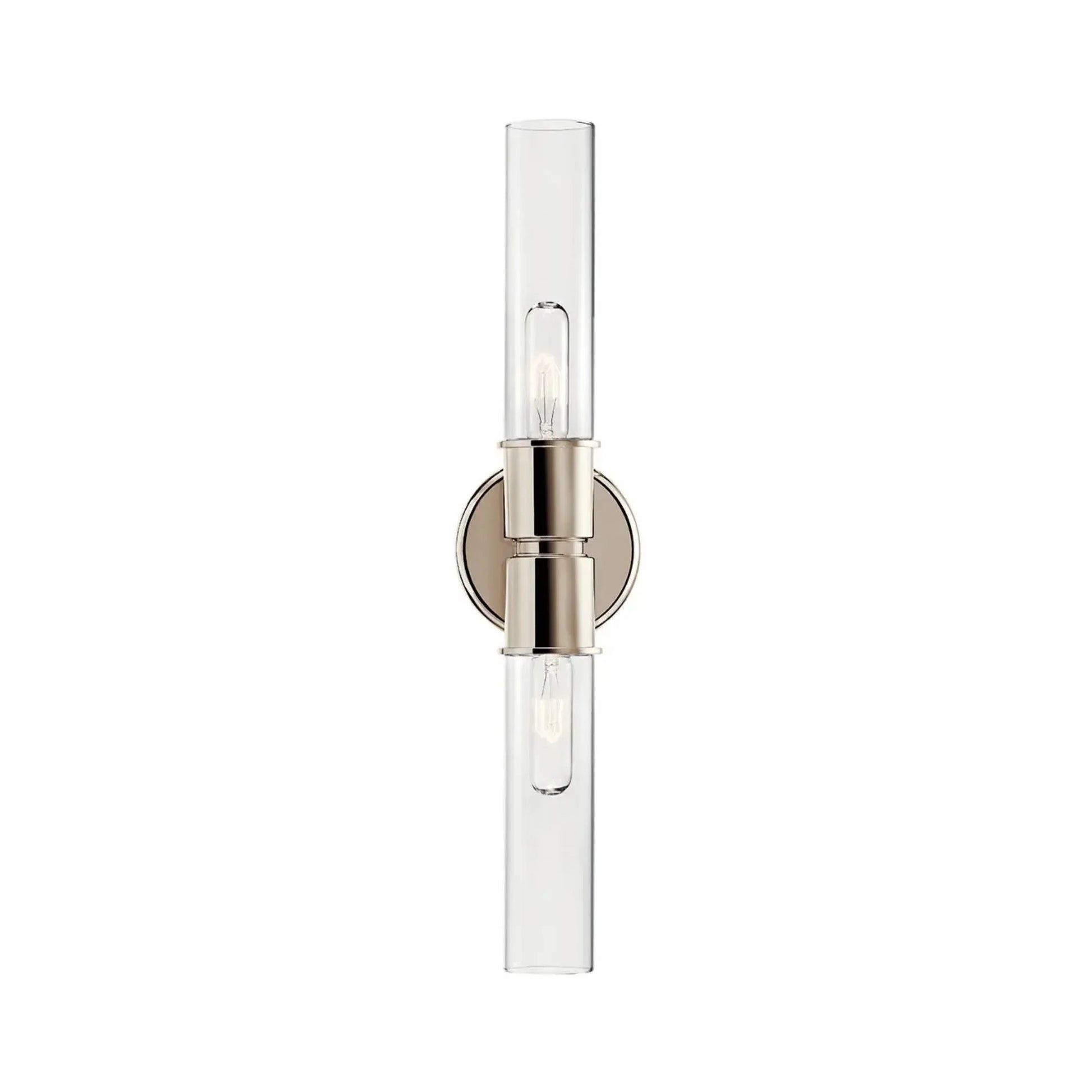 The Kichler Aviv wall sconce, model 52654PN, embodies contemporary modern design with its sleek polished nickel finish and durable steel construction. This fixture stands at a height of 24 inches and a width of 5.5 inches, featuring two lights that require E26 medium base bulbs, each with a maximum wattage of 60W. Bulbs are not included.