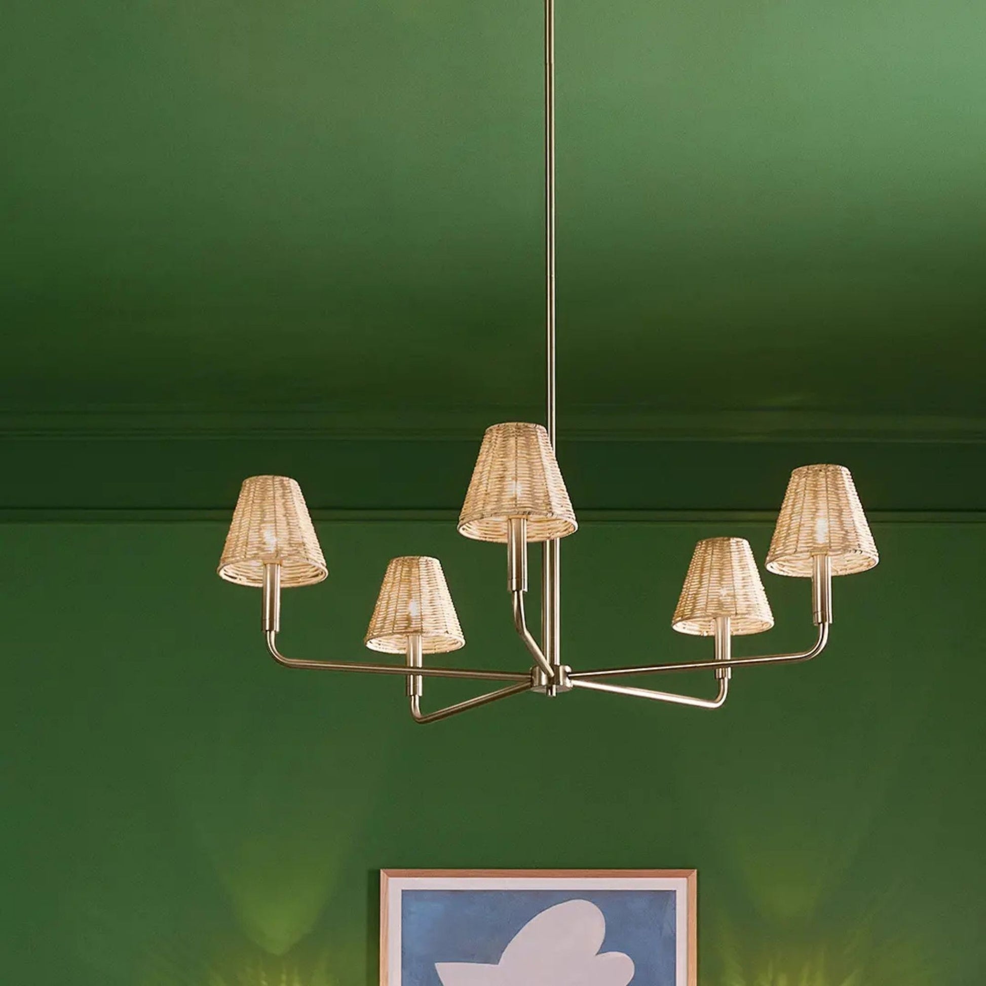 This chandelier embodies a blend of modern and rustic styles, with its Champagne Bronze finish and Rattan Cone Shades. The shades provide a warm, diffused light, perfect for creating an inviting atmosphere in dry-rated indoor spaces.