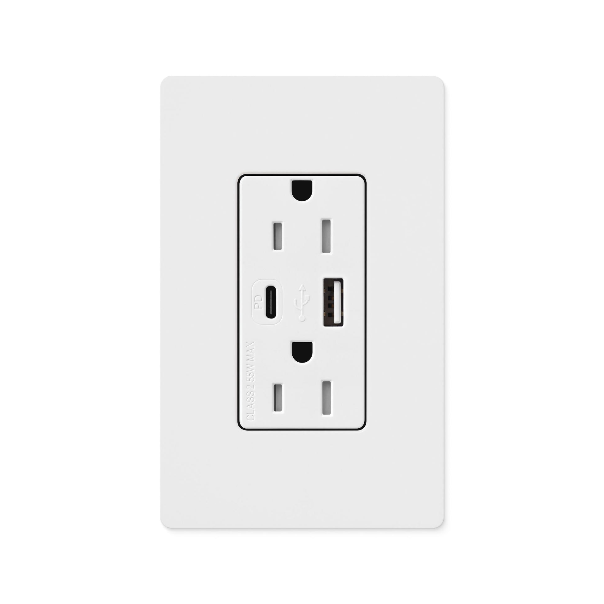The Lutron Claro CAR-15-ACTR-WH installs easily into standard single-gang electrical boxes using side or back wire installation. The receptacle accepts up to two 14 AWG to 10 AWG (1.5 mm² to 6.0 mm²) wires per terminal and supports solid or stranded copper wires only. Minimum wallbox dimensions are 3 inches (76 mm) H x 2 inches (51 mm) W x 2.5 inches (64 mm) D. The USB Type C port features Power Delivery capability, providing up to 55W (20V 2.75A) when used as a single port, or up to 45W when both USB ports are in use simultaneously. The USB Type A port provides 5V 1.5A output. The tamper-resistant outlets comply with UL498 and provide enhanced safety for homes with children. Compatible with USB 1.1/2.0/3.0/USB PD 3.0 devices and battery charging specification BC1.2.
