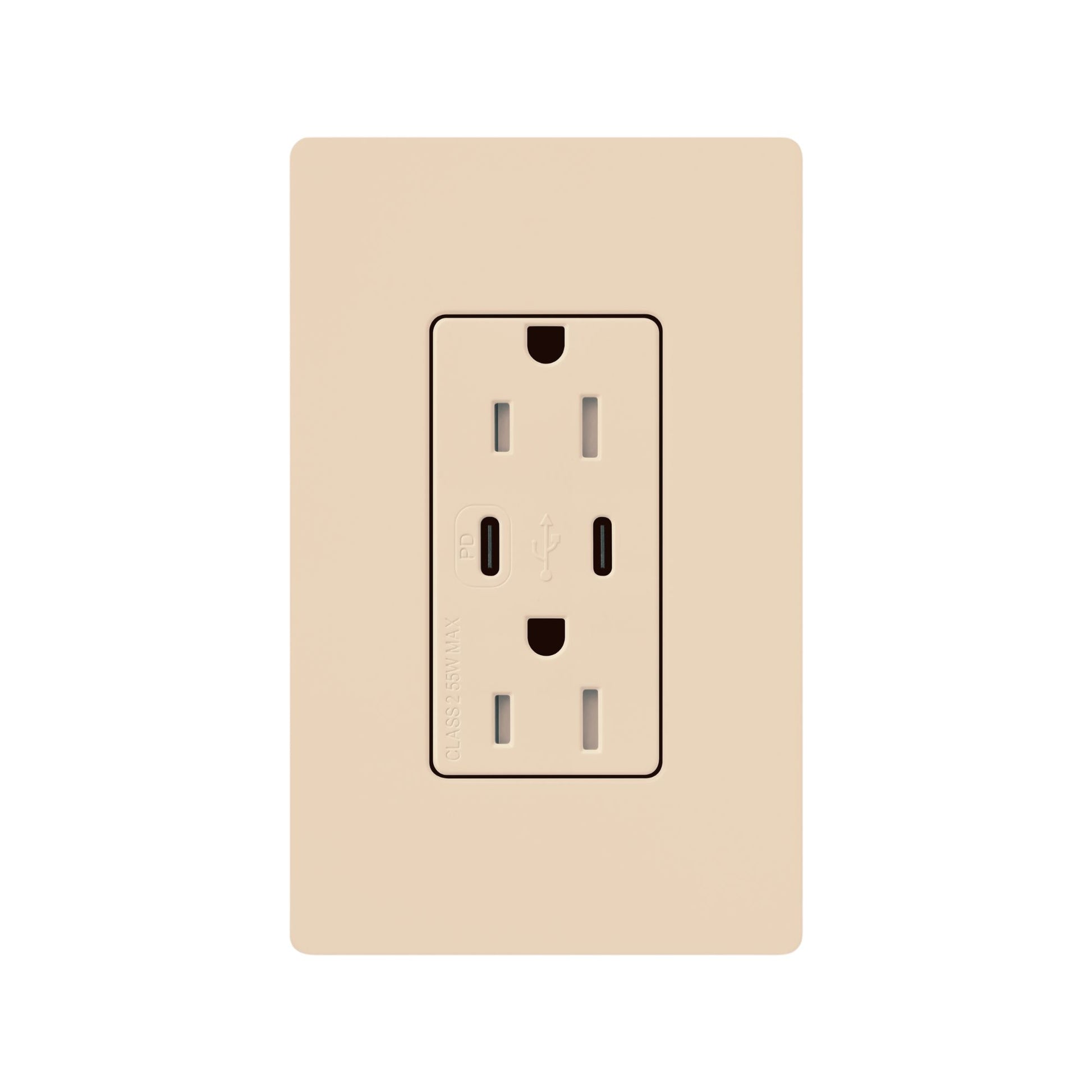 The CAR-15-CCTR-LA is a Lutron Claro 15A tamper-resistant USB Type C + C duplex receptacle in Light Almond designed to provide convenient fast charging and power in one elegant device. Experience superior charging performance and design harmony with a receptacle engineered to match the color and texture of Lutron controls and wall plates. Featuring dual USB Type C ports with Power Delivery up to 55W for up to 70% faster charging than 5W USB, plus tamper-resistant outlets for enhanced safety—ideal for residential and commercial installations requiring modern USB-C charging solutions with premium aesthetics.