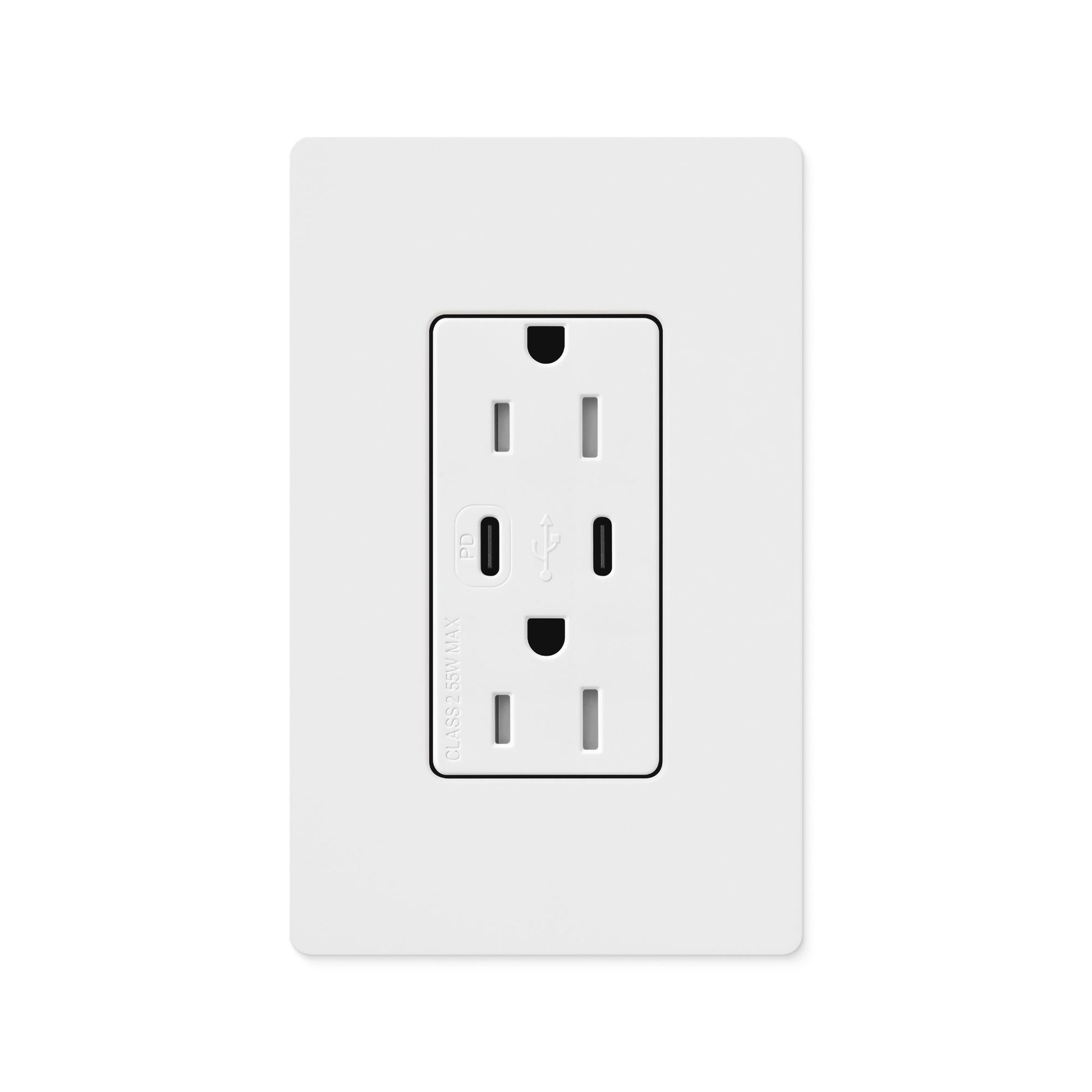 The CAR-15-CCTR-WH is a Lutron Claro 15A tamper-resistant USB Type C + C duplex receptacle in White designed to provide convenient fast charging and power in one elegant device. Experience superior charging performance and design harmony with a receptacle engineered to match the color and texture of Lutron controls and wall plates. Featuring dual USB Type C ports with Power Delivery up to 55W for up to 70% faster charging than 5W USB, plus tamper-resistant outlets for enhanced safety—ideal for residential and commercial installations requiring modern USB-C charging solutions with premium aesthetics.