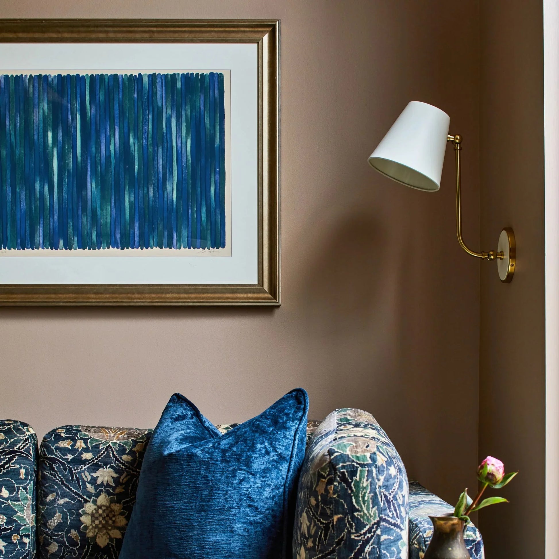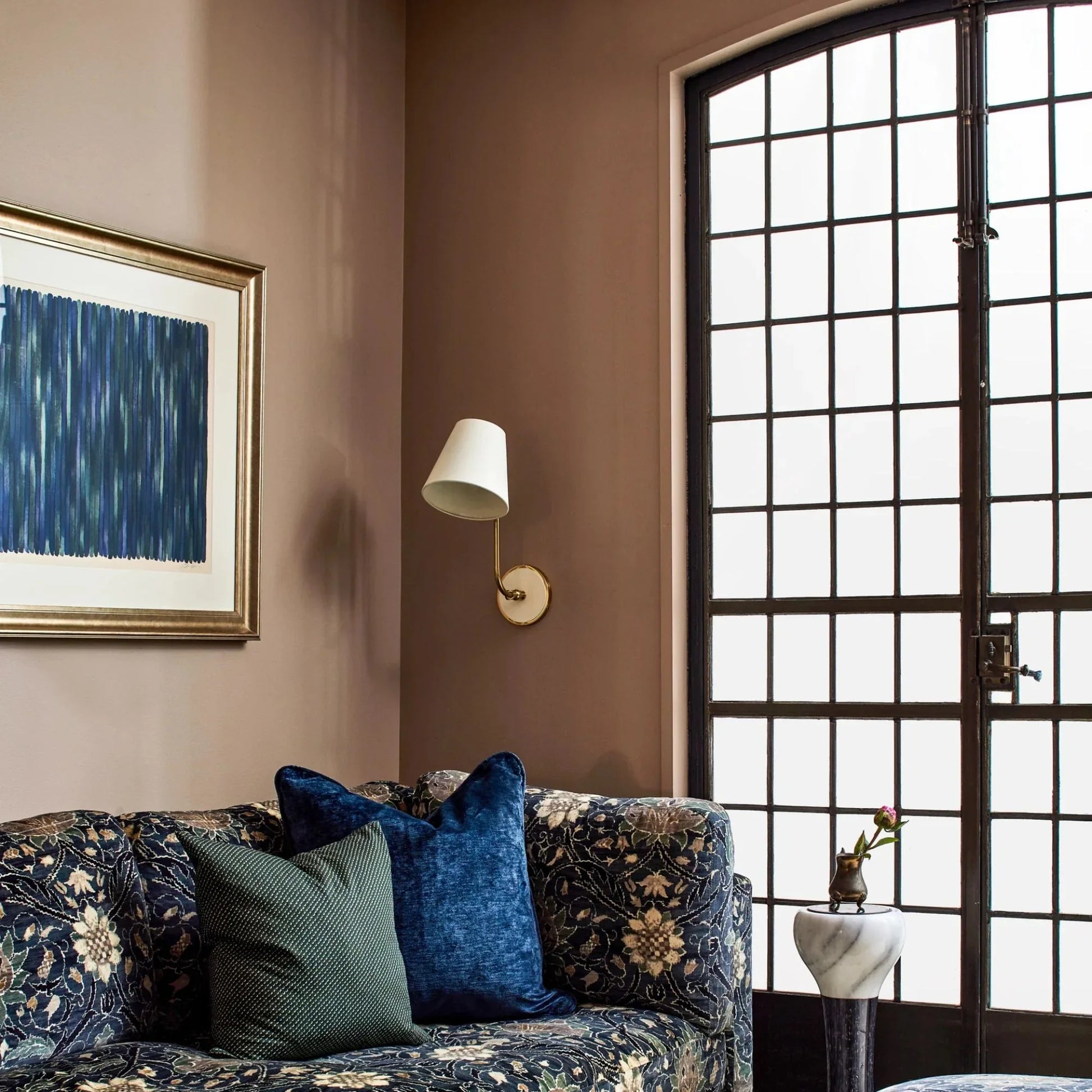 - Elegant Form: tapered shade is supported by a gently curved arm and finished in aged brass.