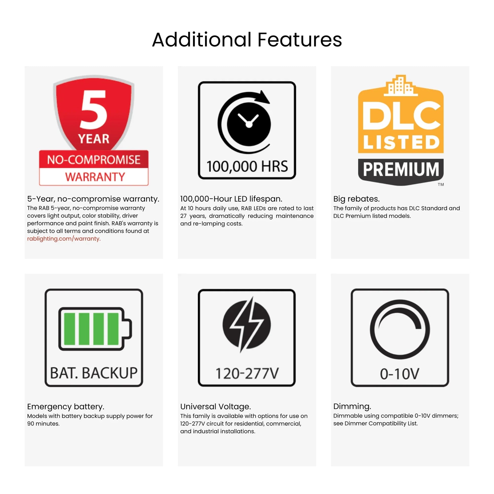 - RAB Quality: 75+ years lighting expertise, 5-year comprehensive warranty, field-proven commercial-grade construction