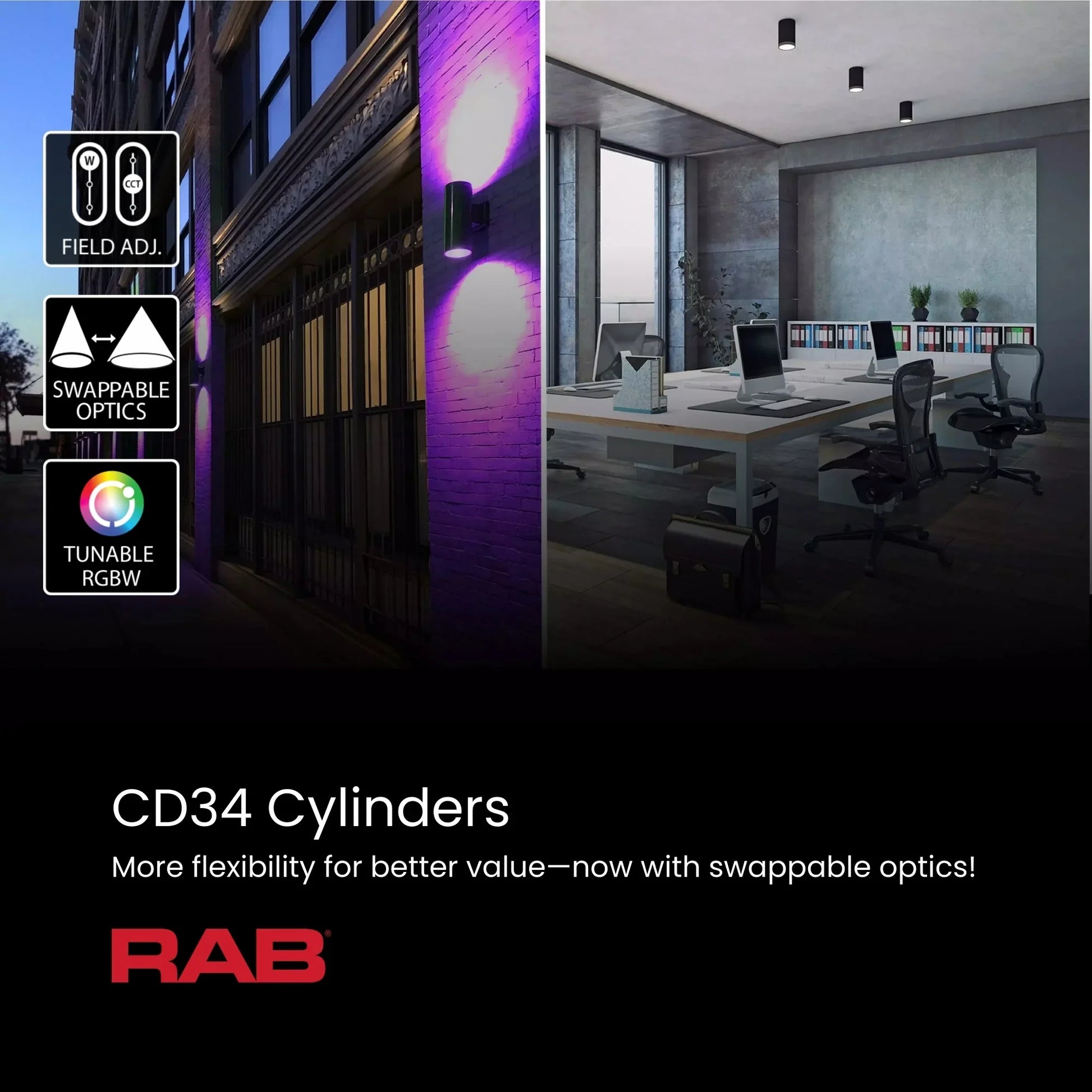 The RAB CD34-3WK provides compact up/down wall lighting in a 3-inch black cylinder. With field-selectable wattage (10W/8W/6W), field-selectable color temperatures from 3000K to 5000K, and up to 1000 lumens, this wall mount fixture delivers architectural accent lighting for residential pathways, small commercial entryways, landscape features, and applications where minimal footprint and maximum versatility are required.