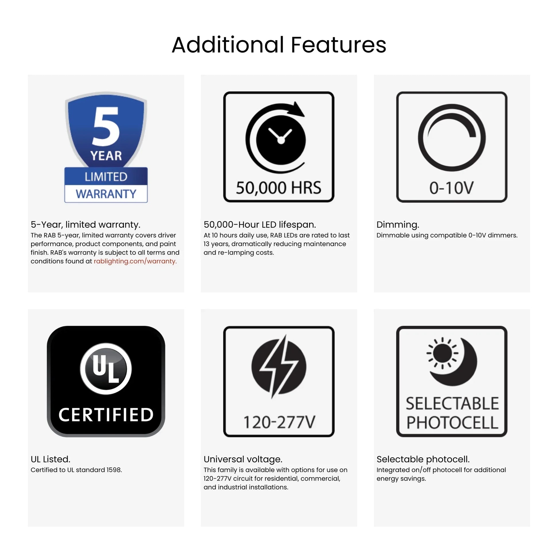 - Integrated Photocell: Built-in dusk-to-dawn photocell with a manual on/off switch provides automated security and maximum energy efficiency.
