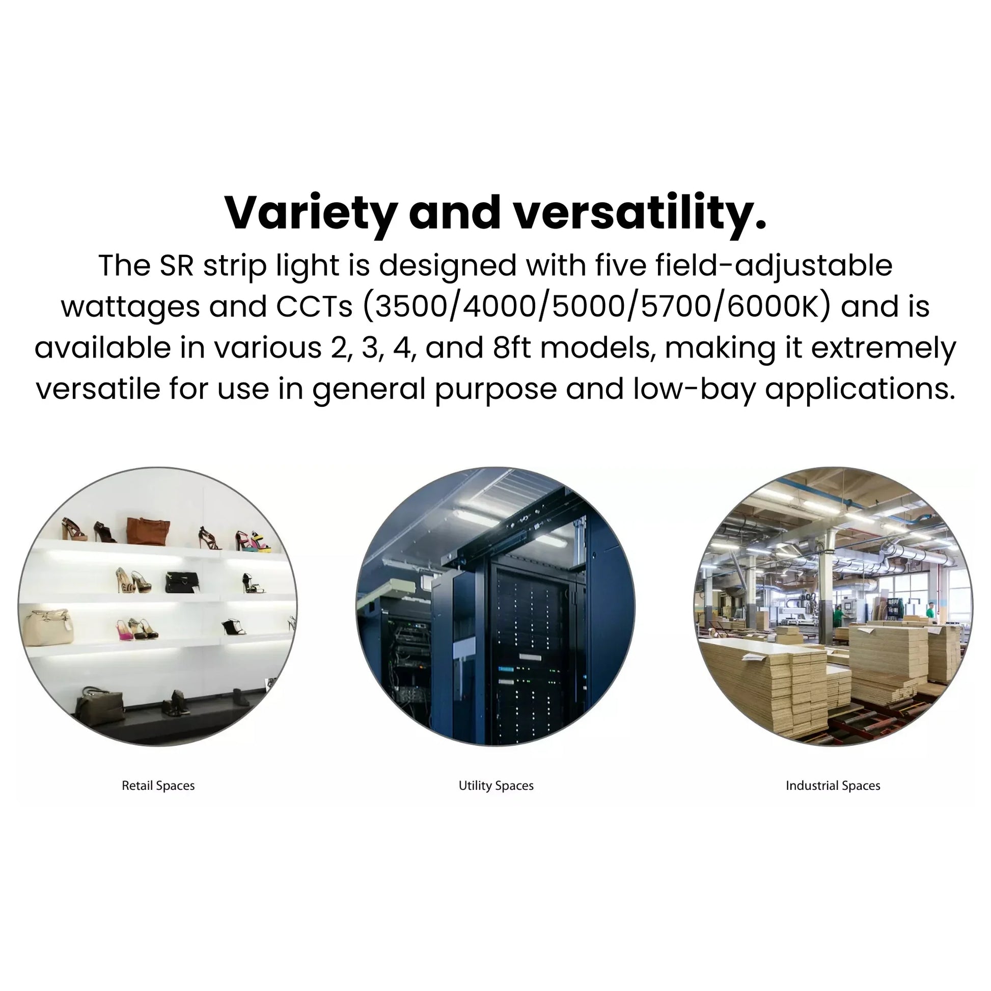 DLC listed for utility rebate eligibility, the SR8 delivers up to 159 lumens per watt—reducing energy consumption by up to 70% compared to legacy fluorescent strip fixtures. With a 50,000-hour rated life and 5-year limited warranty, the SR8 provides long-term reliability and low total cost of ownership.