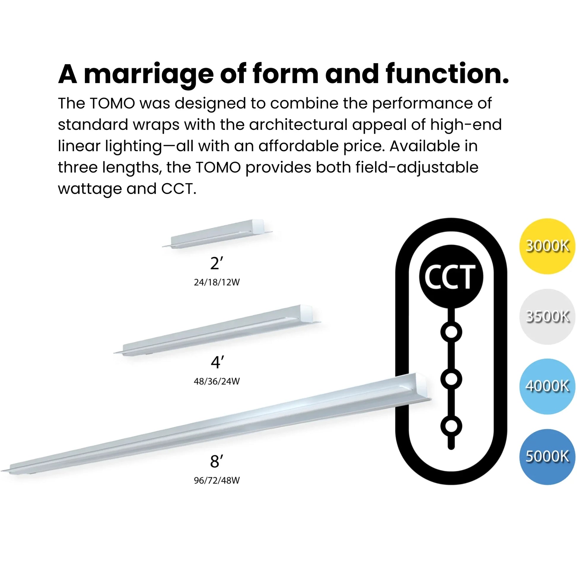 The RAB TOMO-2 2ft LED strip light delivers field-adjustable performance with exceptional longevity in a compact, suspended mount design. With selectable 12W/18W/24W wattage, four-step CCT adjustment (3000K-5000K), and up to 3,332 lumens output, this versatile 2-foot fixture adapts to any commercial or residential lighting requirement on-site. The TOMO series features a 100,000-hour rated life—more than double the lifespan of standard LED fixtures.