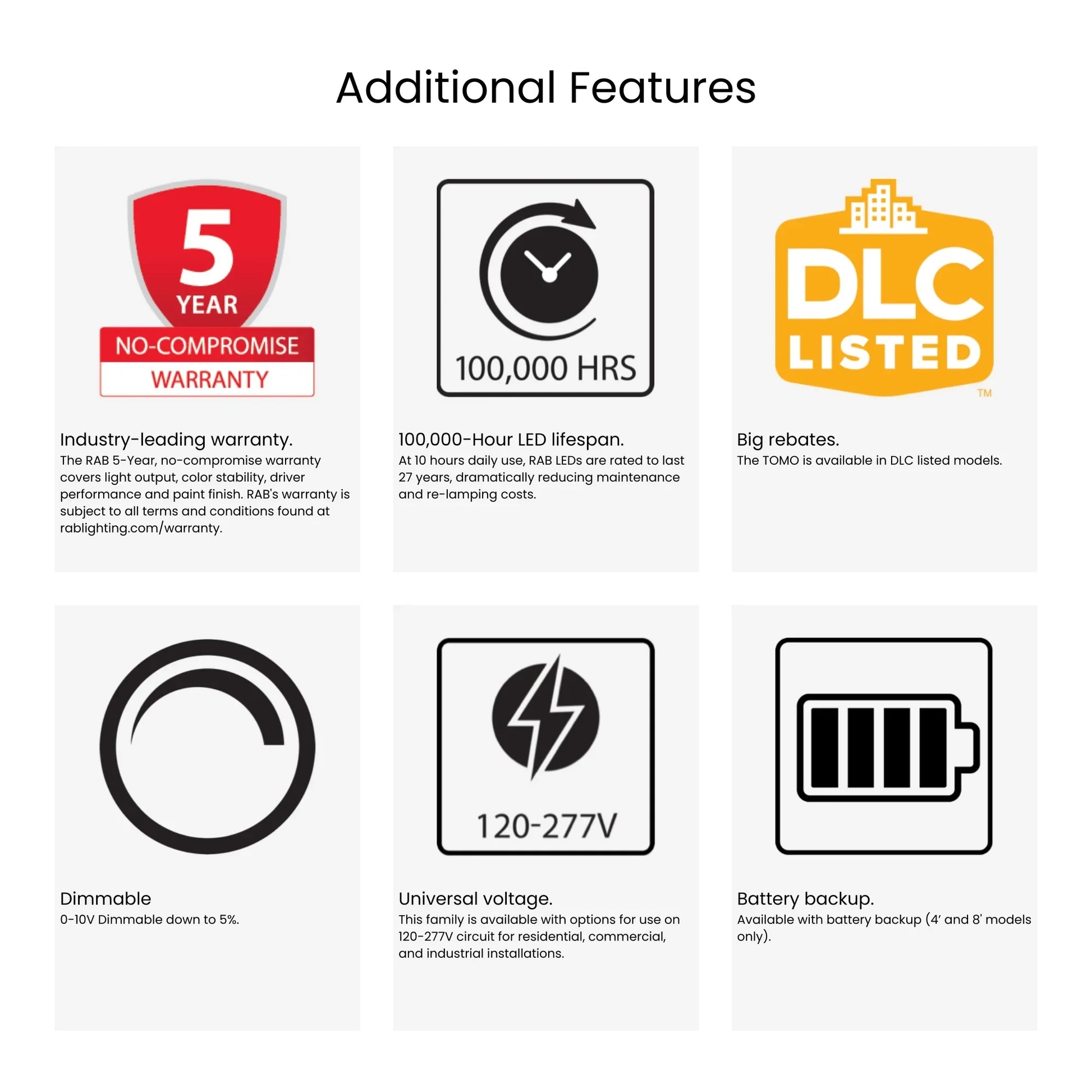 RAB Lighting's TOMO series combines decades of engineering expertise with cutting-edge LED technology. The TOMO-2 is DLC listed, TAA compliant, backed by a 5-year limited warranty, and rated for 100,000 hours of reliable operation. RAB's commitment to quality and innovation makes the TOMO series a trusted choice for contractors, specifiers, and facility managers seeking maximum longevity and flexibility.
