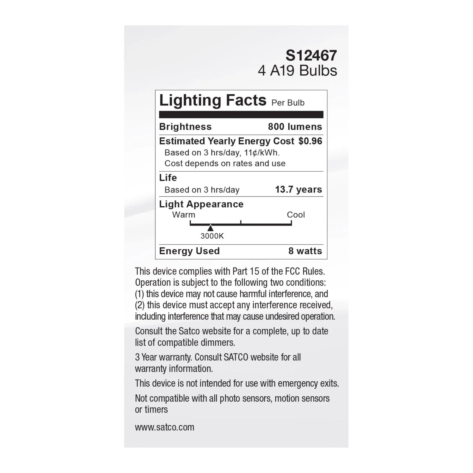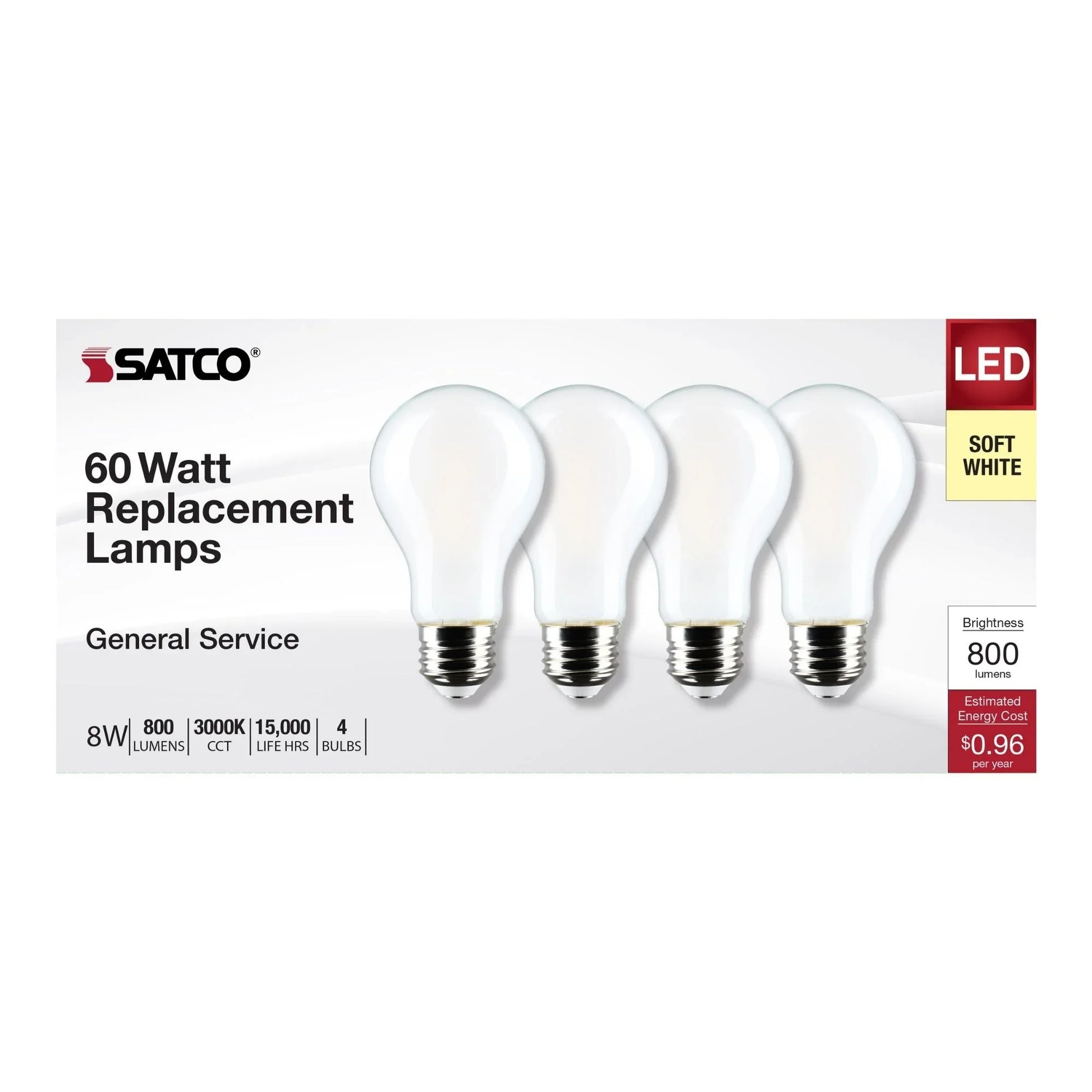 A19 LED Bulb, 60W Equal, 8 Watts, 800 Lumens, 3000K, E26 Medium Base, Frosted Finish, Pack of 4