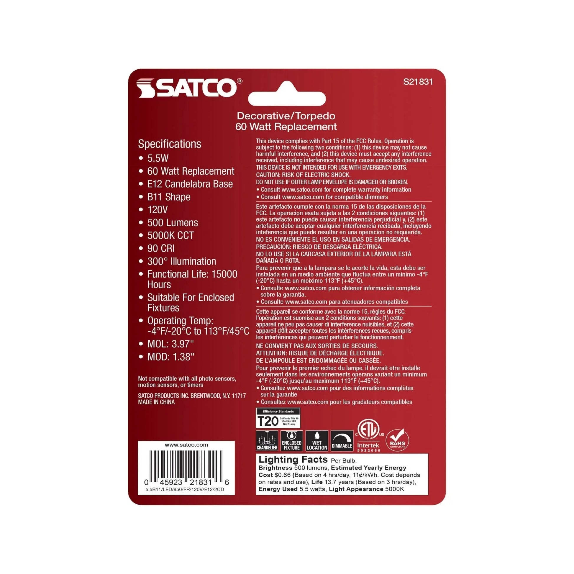 B11 Candle LED Bulb, 6W, 500 Lumens, 5000K, E12 Candelabra Base, Frosted Finish, Pack of 2
