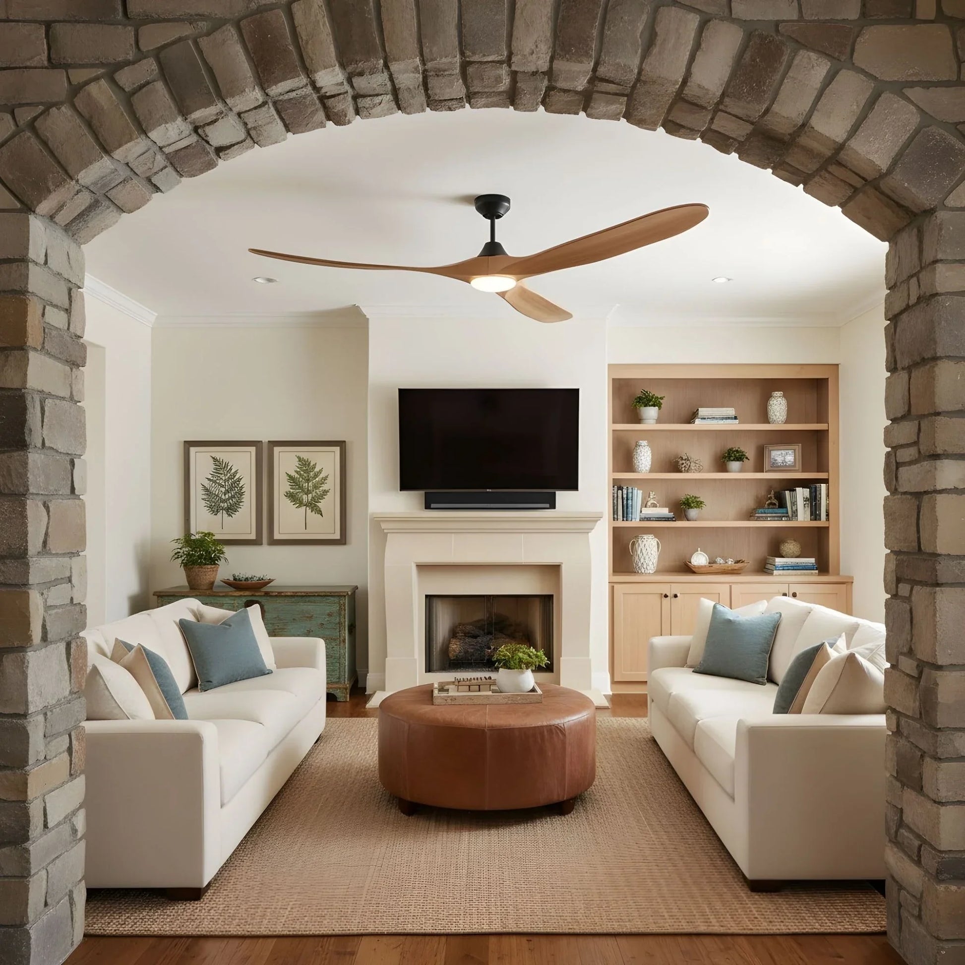 - Hand-Carved Artisan Blades: Each fan features meticulously hand-carved balsa wood blades finished in rich honey tones, combining natural beauty with lightweight aerodynamic performance that delivers powerful airflow while maintaining whisper-quiet operation.